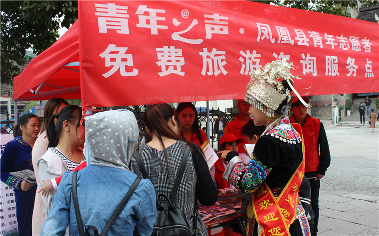 鳳凰縣青年(nián)志願者為(wèi)遊客提供免費旅遊咨詢。圖片來源:湖南文明網