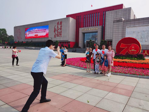 2019年(nián)國(guó)慶節期間,遊客在“慶祝中華人民共和(hé)國(guó)成立70周年(nián)”紅(hóng)色元素前留影,宣講員鄧琦在為(wèi)遊客拍照。圖片來源:湖南雷鋒紀念館
