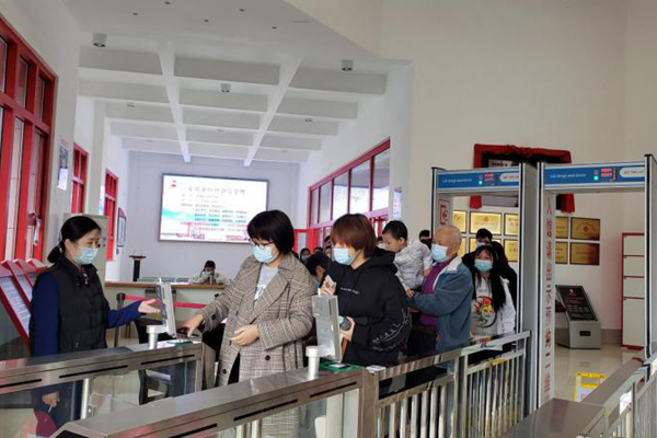 在湖南雷鋒紀念館遊客中心,工作人員正在引導遊客刷預約二維碼進閘機(jī)入館參觀。圖片來源:湖南雷鋒紀念館