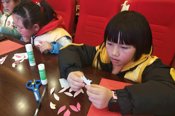 1月8日,湖南雷鋒紀念館“‘雷小鋒’種子(zǐ)工程”2020年(nián)寒假中小學(xué)生社會實踐活動啓動。課堂中,小朋(péng)友正在制作禮讓花。圖片來源:雷鋒網 記者 劉旺 攝