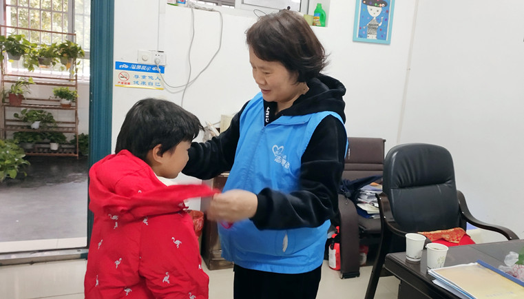 晚報志願者李詠梅幫“暖心行(xíng)動”受助孩子(zǐ)試穿新棉衣。圖片來源:株洲文明網