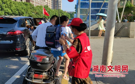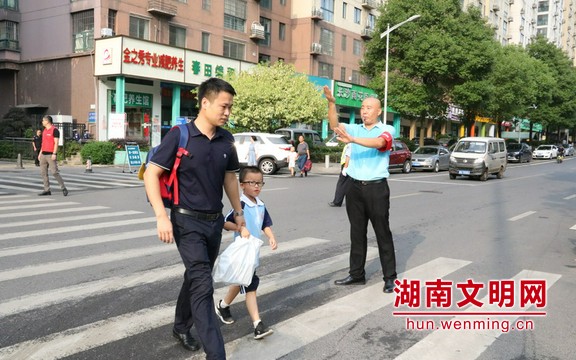 長(cháng)沙楓樹山蓮湖小學(xué)門口,井灣子(zǐ)街道(dào)湘蓮社區志願者引導學(xué)生家長(cháng)過馬路。圖片來源:雨花區文明辦