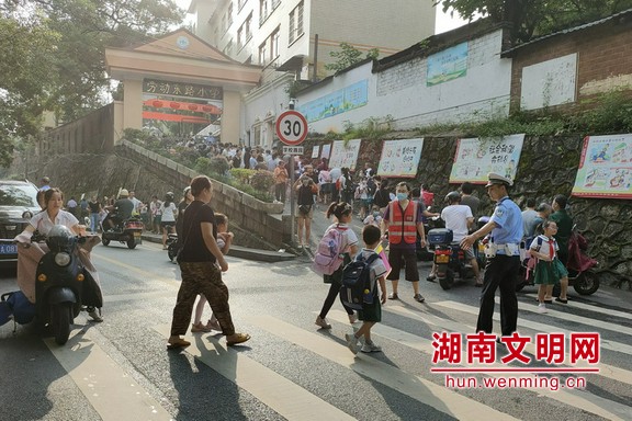 雨花區交警大隊二中隊交警在勞動東路小學(xué)門口指揮交通。圖片來源:雨花區文明辦