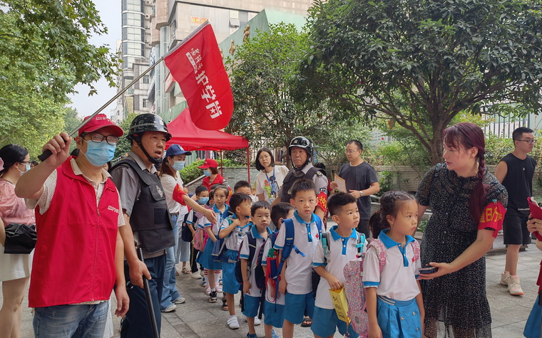 長(cháng)沙井灣子(zǐ)街道(dào)井旺社區志願者護送學(xué)生進校園。圖片來源:雨花區文明辦
