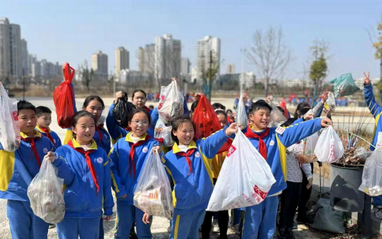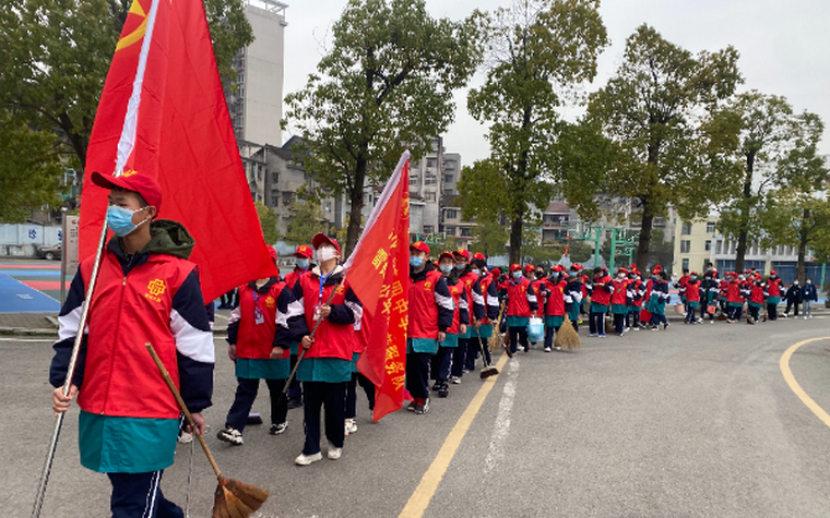 在雷鋒巨幅頭像主題宣誓儀式後,學(xué)生們化身小小志願者,帶着清掃工具走出校園,來到穿紫河旁竹園社區文化廣場。大家分組有(yǒu)序地(dì)清理(lǐ)了沿街各類垃圾,徹底清除衛生死角。