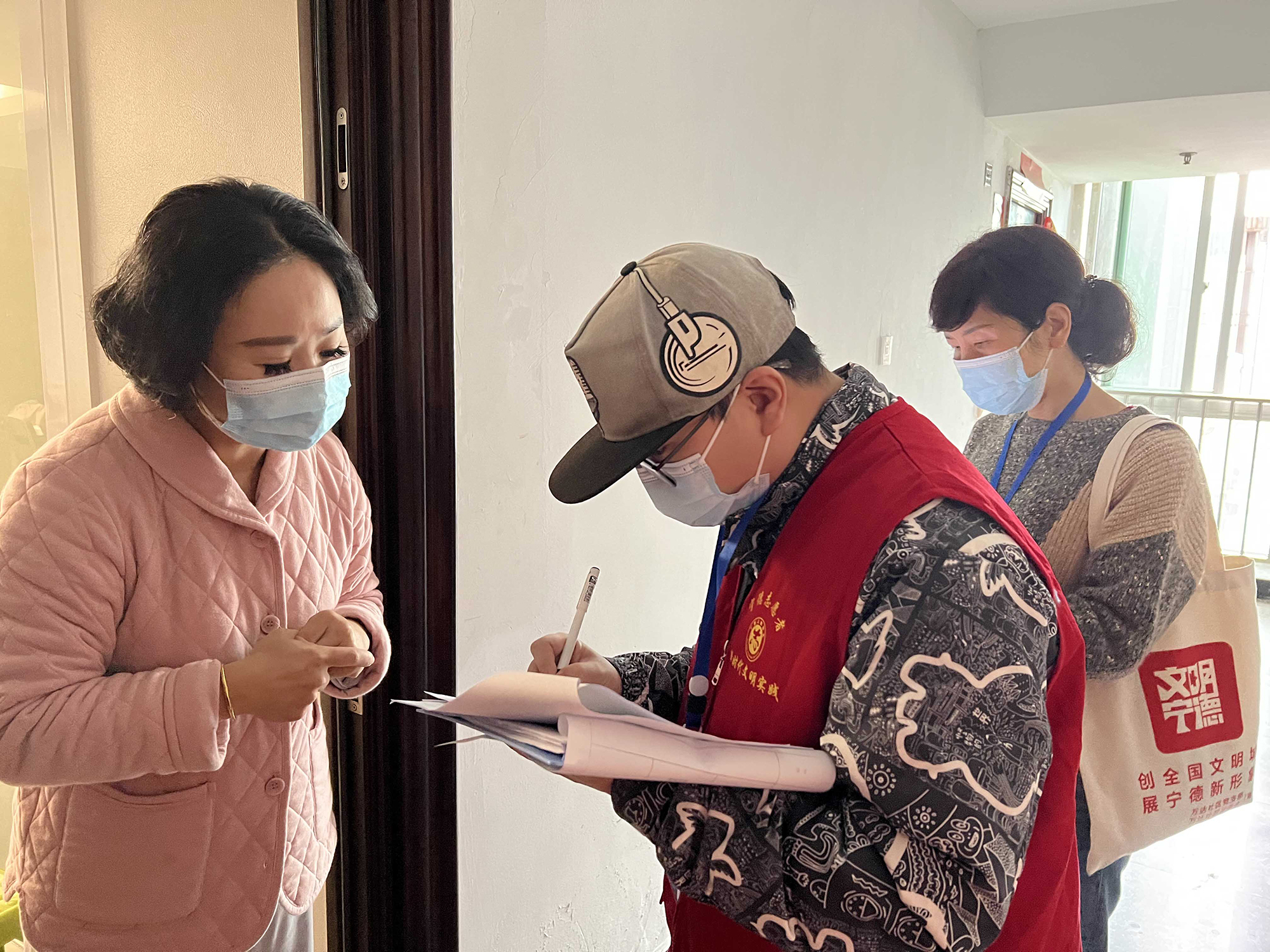 3月26日以來,甯德市(shì)委文明辦每天組織幹部職工下沉萬達社區開展疫情防控志願服務活動。黨員志願者們身着“紅(hóng)馬甲”穿梭小區各樓道(dào)間,逐戶開展信息排查,向群衆宣傳、講解防疫措施。甯德市(shì)委文明辦 供圖